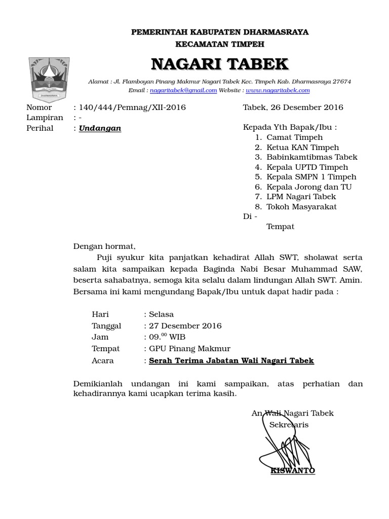 Posted on by jay liem. 10th maret 2021 4 min read. Pada resepsi syukuran pelantikan kepala desa tanggal 16 desember 2016. Contoh surat bisnis, surat dinas, surat izin, surat kuasa, surat lamaran kerja, surat pemberitahuan, surat penawaran, surat pengunduran diri, surat peringatan, surat perjanjian, surat pernyataan, surat resmi, surat undangan. Contoh surat undangan rapat karang taruna.