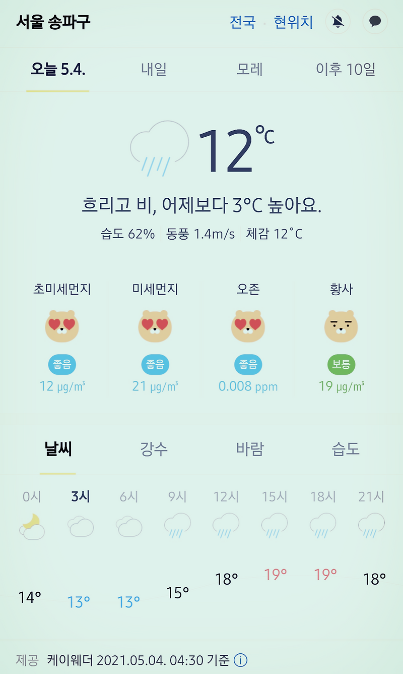 월요일인 오늘(10일)은 중국 산둥반도 부근에서 다가오는 기압골의 영향으로 전국이 대체로 흐리겠다. 서울의 낮 최고기온은 13도까지 오르겠고 대전은 15도, 전주 16도, 대구 17도 등 어제보다 조금 높다고 전했다. 강원 영동에는 바람이 매우 강하게 불고, 그 밖의 지역에서도 돌풍이 부는 곳이 있어 안전사고에 유의해야 한다. 실내·실외 공기측정기 공기측정기 바로가기 날씨와 미세먼지, 동별로 확인하세요. 전국이 대체로 맑겠고, 전라도, 경상도, 제주지역은 밤부터 점차 구름 많아짐.